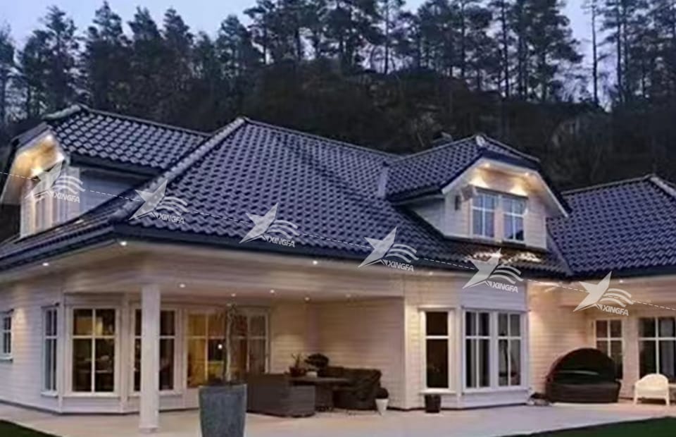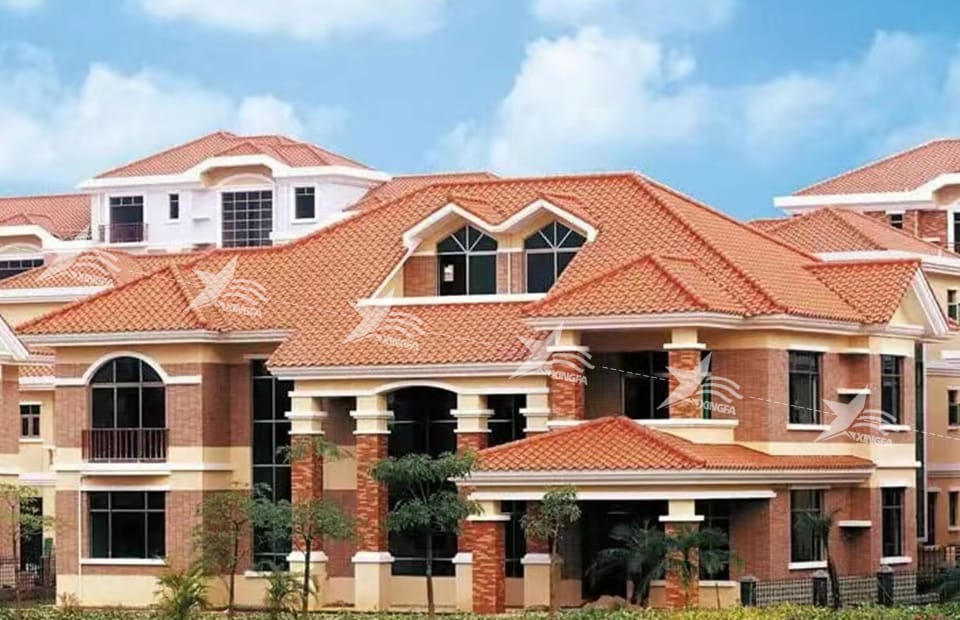 Synthetic resin roof tiles are a new type of anti-corrosion roof tiles designed for residential communities, villas, self-built houses, garden buildings, pavilions, factories, and other places. The synthetic resin roof tiles for villas are light in weight, beautiful in appearance, and corrosion-resistant, adding a charming landscape to the villas. Not only that, it also excels in waterproofing, heat insulation, heat preservation, and flame retardancy.